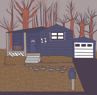 Ariella and Kerigan live in the same neighborhood, so the houses are similar. Ariella's house is in front of the woods. Working again with line in this piece, on the house. Looking at trees to use for the light and shadow. Again the digital piece is not exact. Building up the window light with a linear brush. One big change was the garage, that may change in the future.